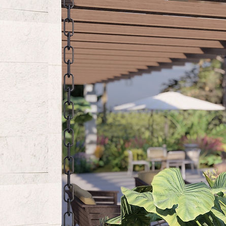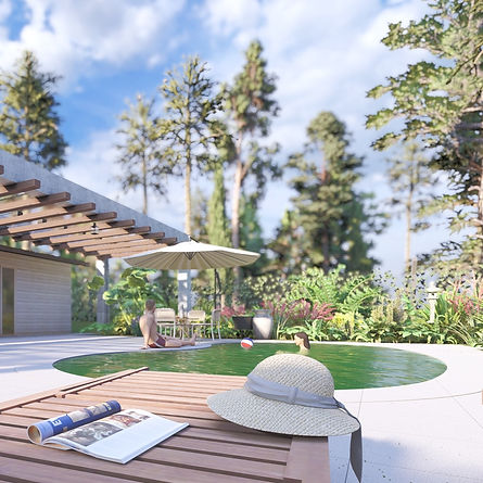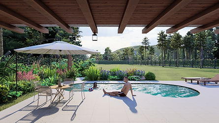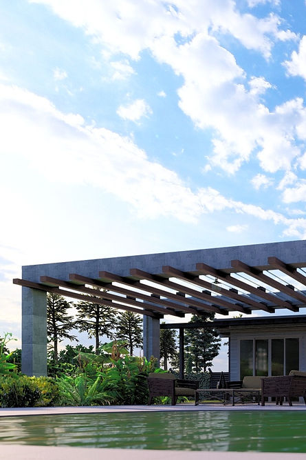 A estrutura em pedra sustenta o sistema proposto de pergolado em madeira, com cobertura retrátil para que seja possível a entrada de luz natural quando necessário. O paisagismo de vegetação tropical busca preencher o espaço em torno da piscina e trazer para dentro do terreno a natureza presente na região.